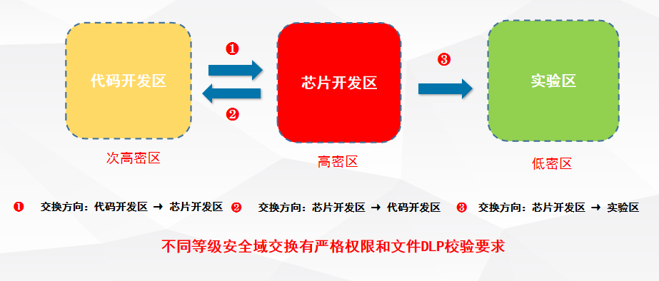 ●研发网通常分为代码开发和芯片开发两大类,其中固件开发区的密级最高,且需要连接固件进行实验/测试,还存在一个实验区,不同区域间存在不同的数据交换场景