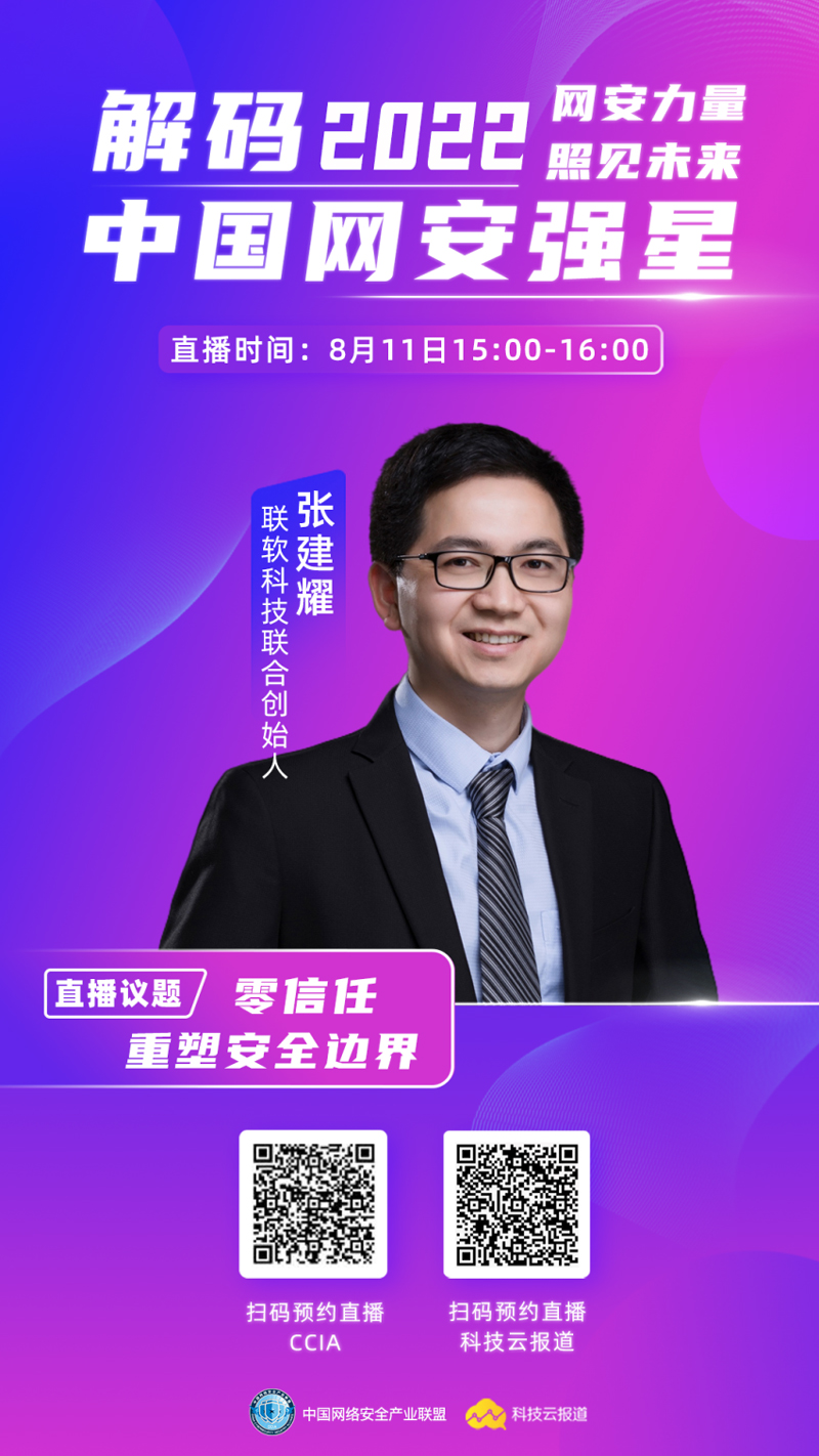 此次,联软科技联合创始人张建耀先生受邀做客“解码2022中国网安强星”直播间,将从行业、技术、市场等多角度探讨零信任热点话题。想要了解零信任安全的您,这场直播一定不能错过!马上扫描图上二维码预约观看。