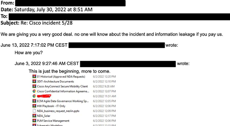 攻击者窃取一名员工的谷歌账号,通过浏览器同步的账密获得了思科内网VPN账号,利用复杂语音钓鱼电话获得了该员工的二次验证码,从而进入内网实施窃密;恶意黑客声称窃取到2.75GB数据,约3100个文件,其中不少文件为保密协议、数据转储和工程图纸。