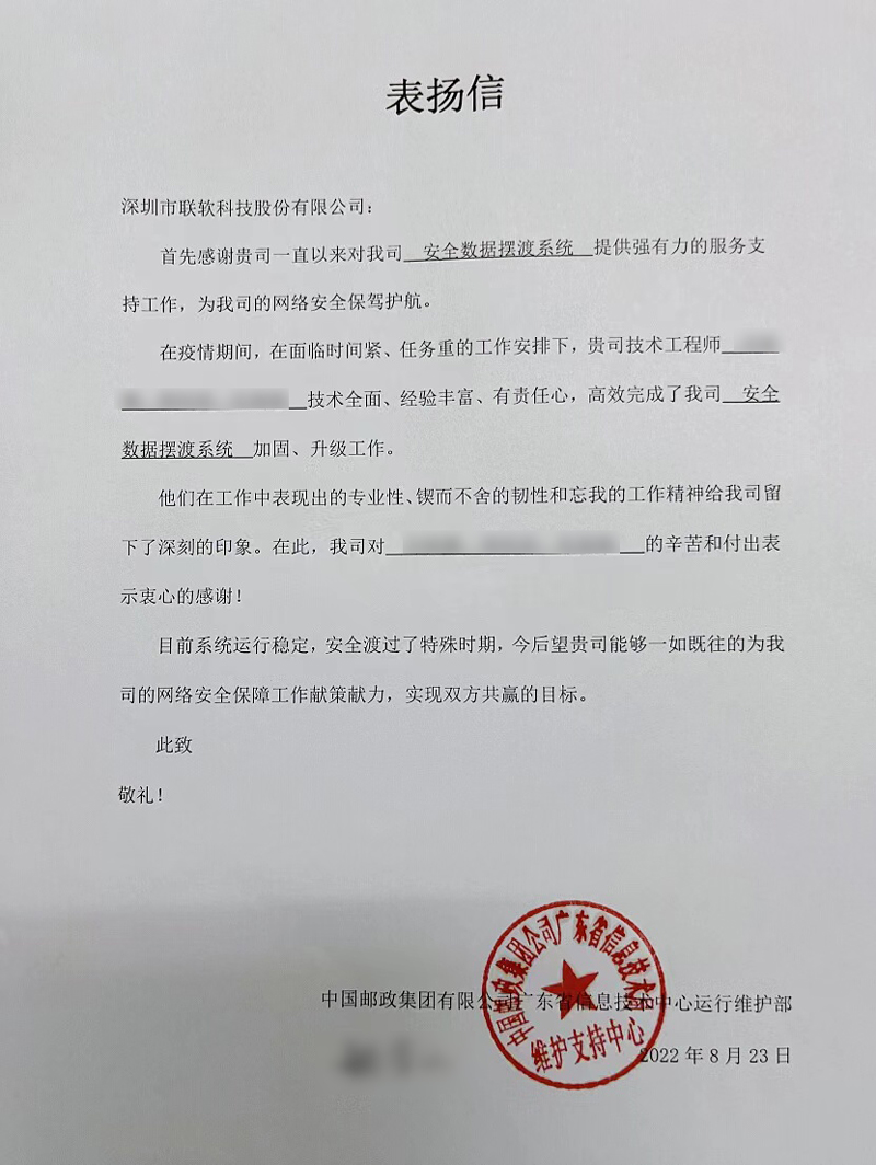 昨日(8月23日),联软科技收到了来自中国邮政集团有限公司广东省信息技术中心运行维护部发来的感谢信。