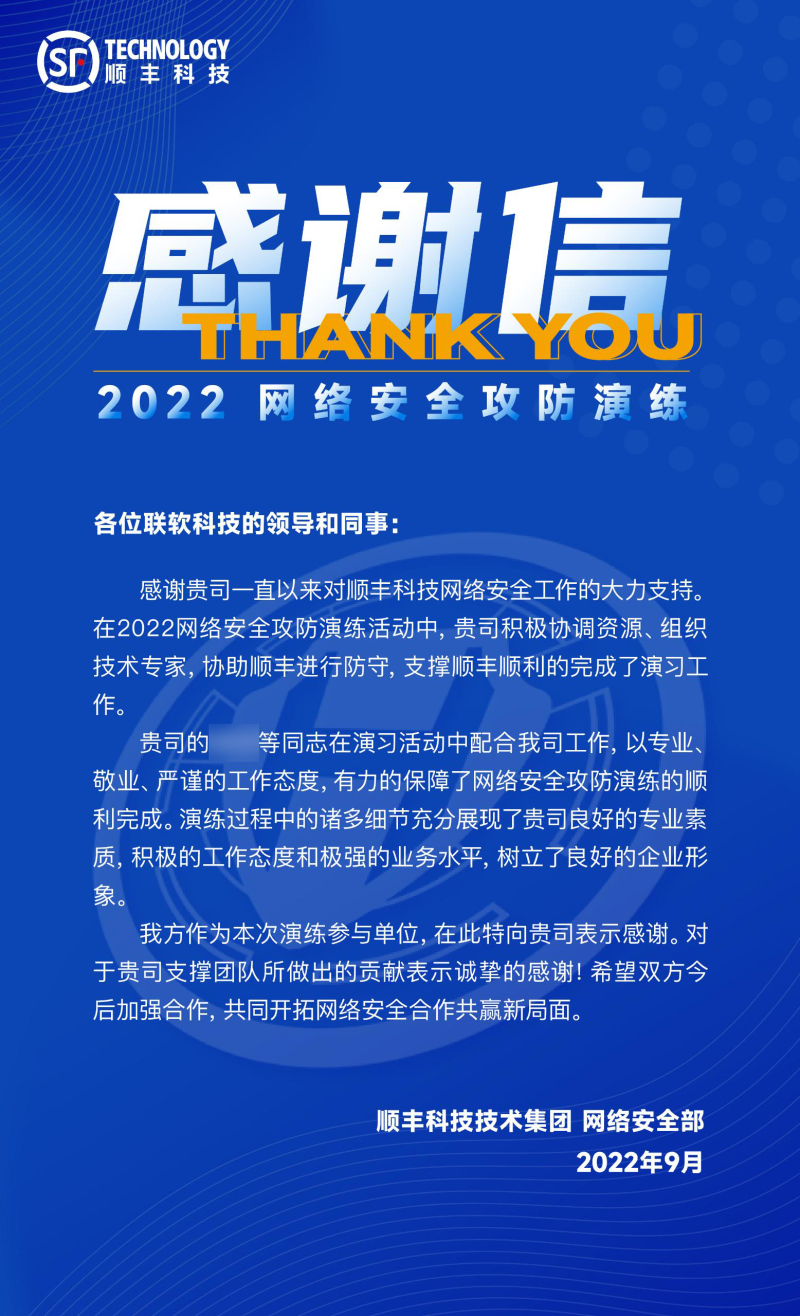 顺丰科技在信中表示,我司积极协调资源、组织技术专家,协助顺丰进行防守,支撑顺丰顺利地完成了演习工作。同时,在信中,顺丰科技对我司此次承担相关工作的技术工程师,给予了高度赞扬。