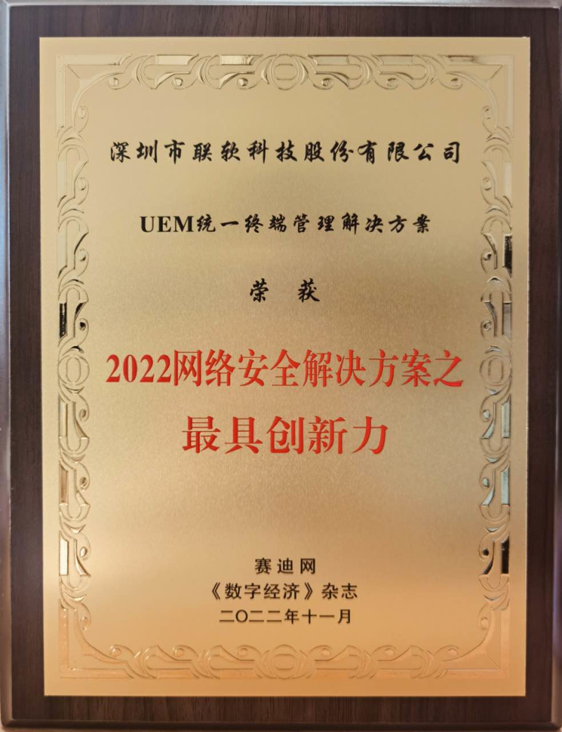 凭借在统一终端管理(UEM,Unified Endpoint Management)领域的前瞻布局与强大的技术创新能力,联软UEM统一终端管理解决方案荣获“2022网络安全解决方案之最具创新力”奖项,再次彰显了联软在该领域的强劲的研发能力和创新能力。
