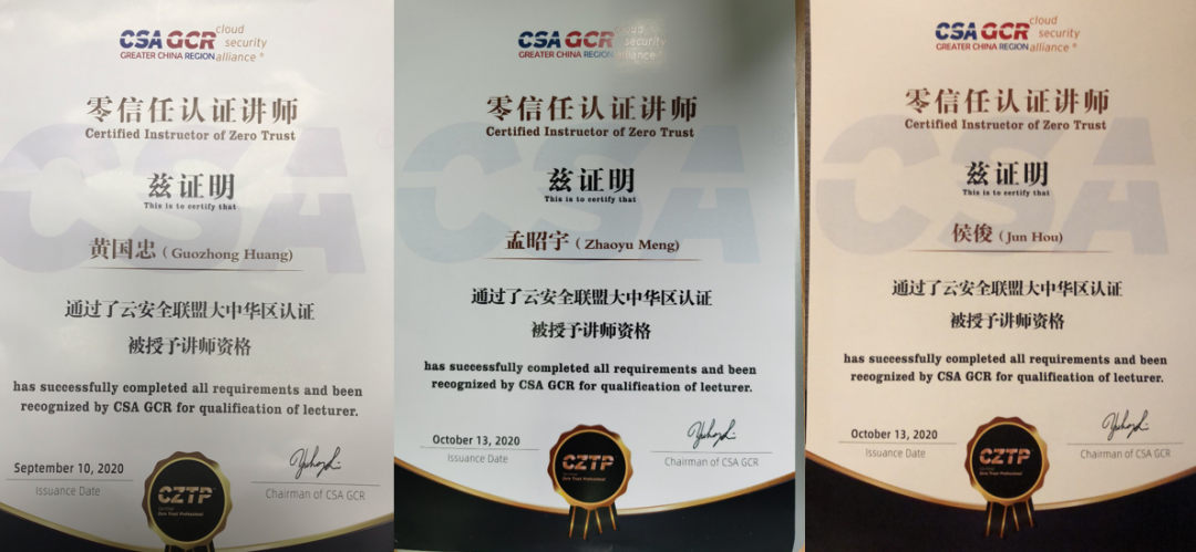 联软科技多名专家成为CSA首批零信任资格讲师,官方认证授予一名种子讲师和两名认证讲师证书。