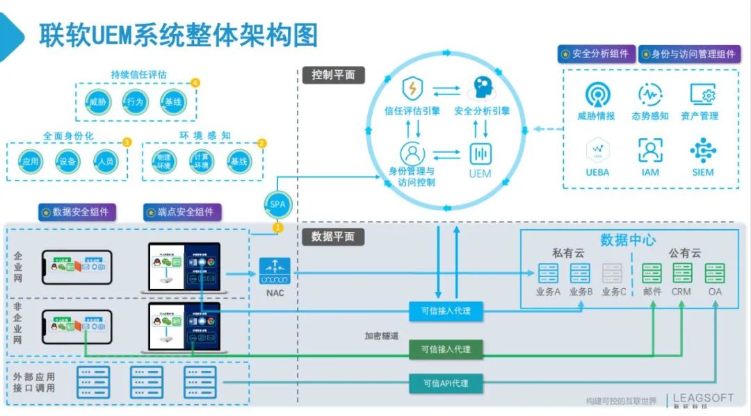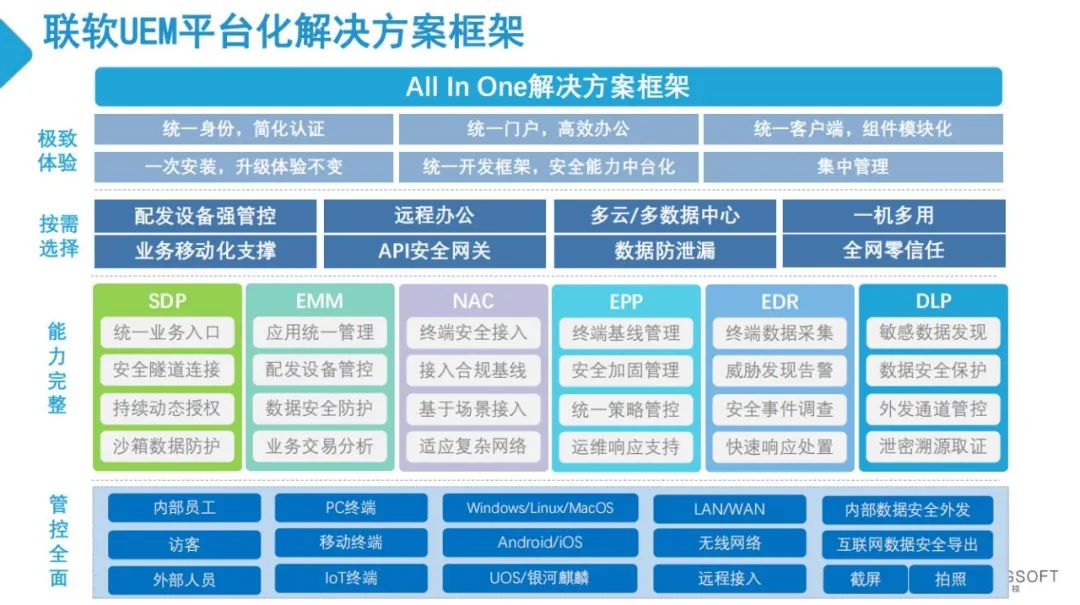针对这些关键要素,联软是怎么做的呢?任前程分享到,联软科技通过在网络安全、云安全、移动安全、数据安全等领域的深厚积累与庞大的用户群体,发布了基于零信任架构的UEM统一终端管理解决方案,一个平台,统一管理,为政企用户解决终端统一管控难题。