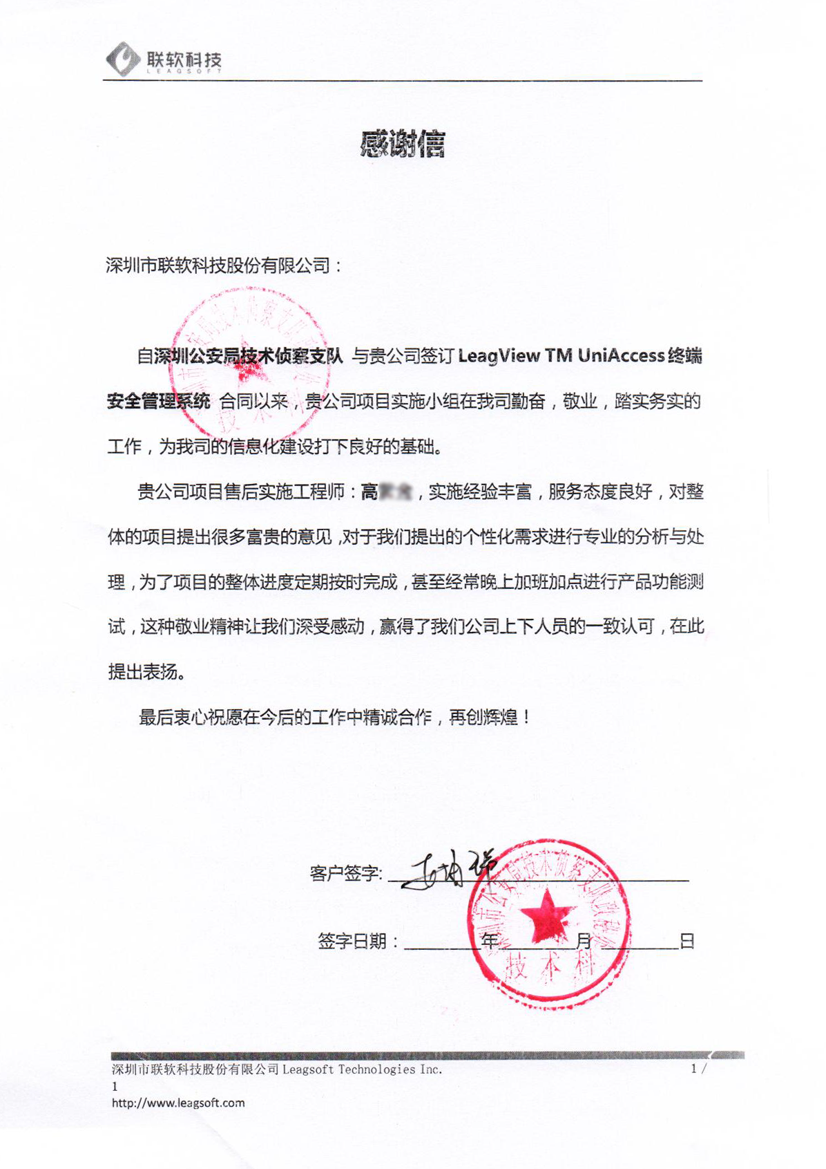 近日,联软科技收到了深圳公安局寄来的感谢信,表扬联软售后工程师高工的优质服务。