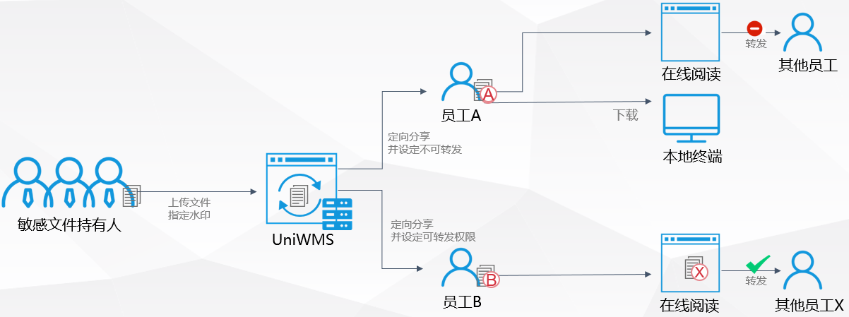 ● 文档通过水印服务器进行流转,水印服务器可将不同水印嵌入到各类文档中,特别是联软具有专利的矢量水印技术,用一种更为隐秘而友好的方式来展现水印,不影响用户阅读,提升用户的安全意识。