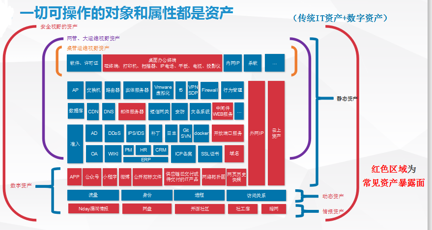 对资产而言,看待的视角不同,关注的资产范畴也不一样。下图中显示了桌面管理视角、IT运维视角的资产、安全视角等如何看资产。其中从安全视角出发,包括关注传统IT资产和数字资产,静态资产、动态资产、情报资产等可能被攻击者利用或损害的所有资产。