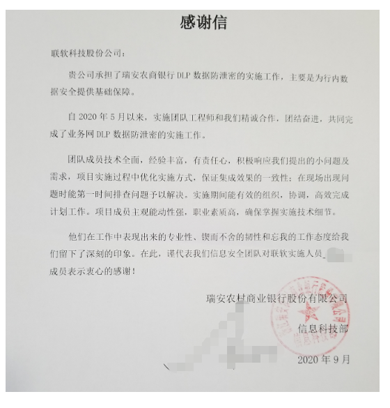 对于瑞安农商行发来的感谢信,联软科技感到十分的荣幸,并感谢相关部门同事在此次项目实施过程当中给予的各方面支持。