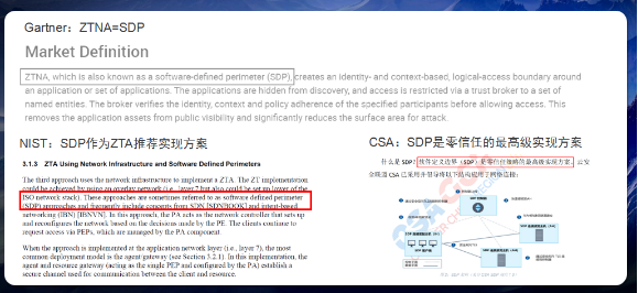 零信任的概念发展至今已有十年,许多厂商也对零信任领域有所涉足。目前对于零信任的实践有三种,即SIM:SDP(软件定义边界)、IAM(增强身份的管理)、MSG(微隔离)。其中,SDP的发展最为成熟,并得到了Gartner、NIST、CSA等机构的强烈推荐。目前企业主要从技术层面、ROI层面、实施层面来评估零信任网络访问。