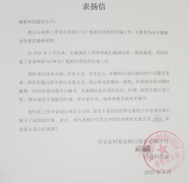 对于淳安农商行发来的感谢信,联软科技感到十分的荣幸,并感谢相关部门同事在此次项目实施过程当中给予的各方面支持。