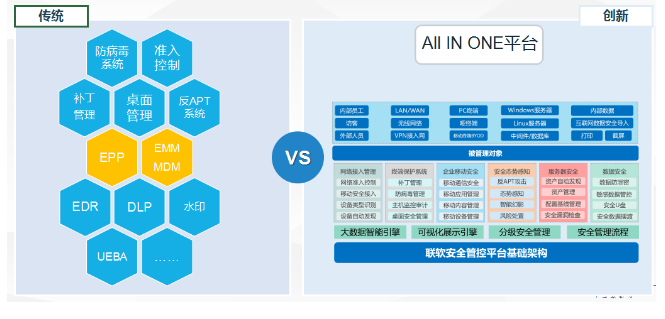 联软将准入、桌管、防泄密等所有功能打造成ALL IN ONE的平台;终端用户无需安装多个客户端、无需适应多个管理流程、无需多个账号,在满足合规要求和不牺牲办公效率的前提下,实现网络、终端、应用及数据的安全防护,符合功能融合的趋势。