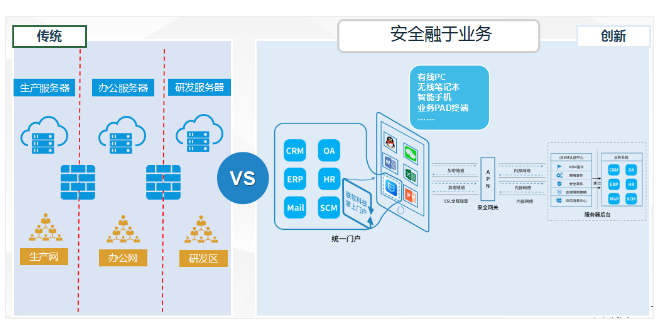 ●将防入侵、防泄密等融合在一个架构中,统一终端、网络、数据中心的安全管理,实现安全与业务融合,在更好地解决安全问题的同时,提升业务效率,降低建设、管理成本
