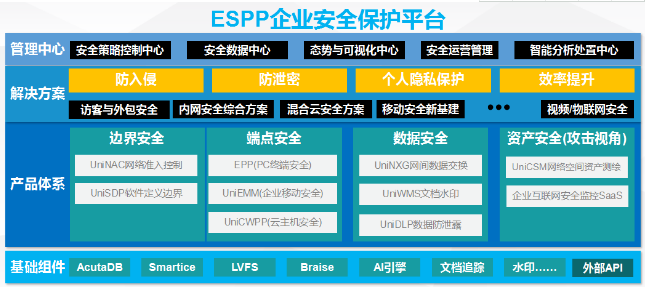 基于TDNA的理念,联软研发出了全新一代企业级安全保护平台ESPP,实现了从架构走向平台化的蜕变,集网络准入控制、终端安全管理、移动设备管理、杀毒管理、云主机安全管理、数据防泄密、终端检测与响应等系统于一体,通过一个平台,统一框架,数据集中,实现更强更智能的安全保护。