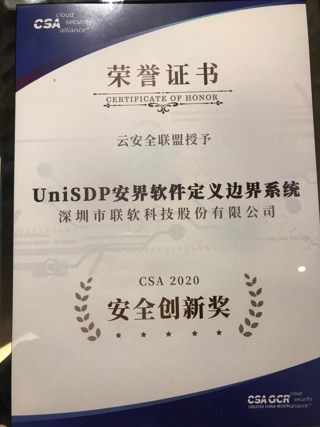 同时,在本次 CSA GCR 大会中,为表彰联软科技在零信任领域以及对 CSA 云安全联盟的杰出贡献,特颁发 “CSA 2020 安全创新奖” 以及 个人“CSA 2020 研究贡献奖”。