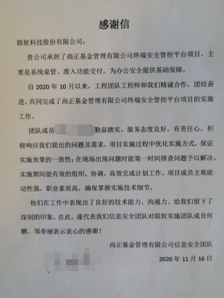 近日,联软科技收到了来自尚正基金管理有限公司(尚正基金)发来的感谢信。