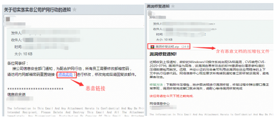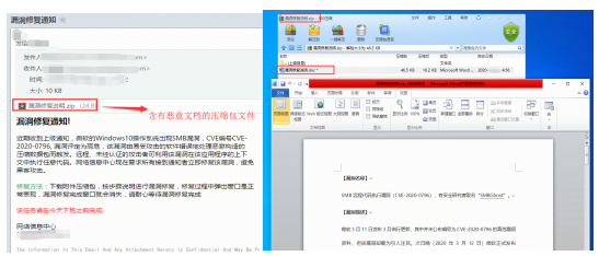 1、攻击者向内网散布钓鱼邮件,邮件伪装成漏洞修复通知,攻击者利用这一点诱使用户下载恶意压缩包文件。