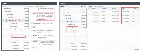 联软UniEDR系统通过对终端进程行为、网络行为的监控,发现WINWORD.EXE启动rundll32.exe,并与远程网络52.109.120.29进行了连接。