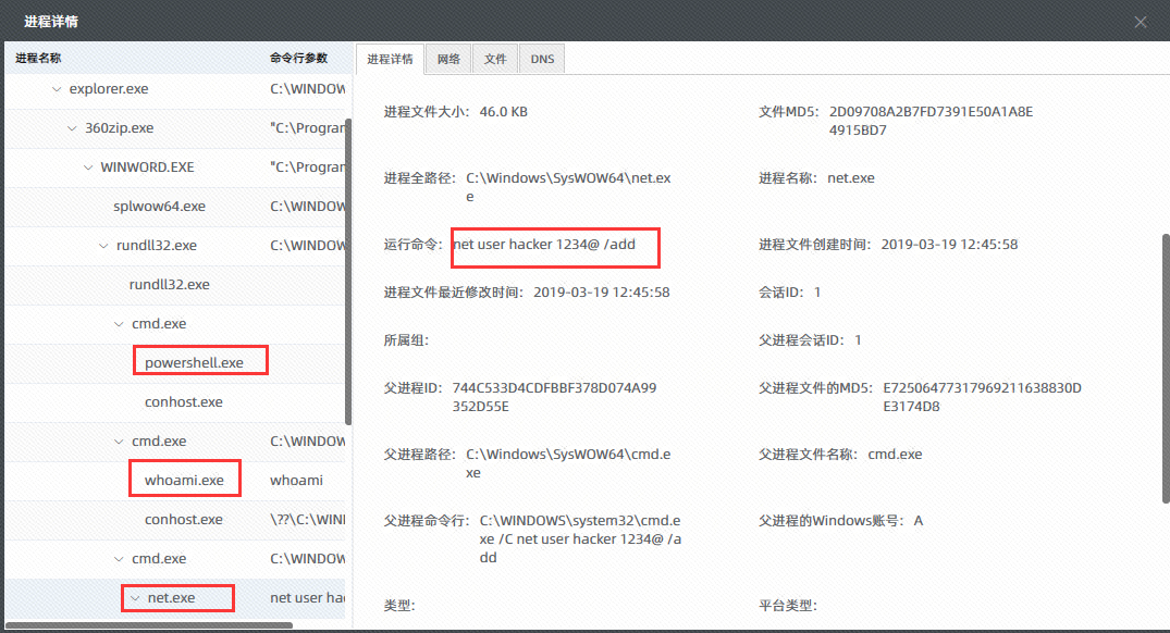 3、而后,又通过调用Powershell.exe和whoami.exe进程进行环境探测,利用net命令新建账户hacker做持久化攻击。