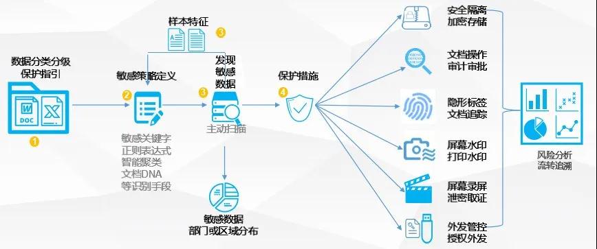 以数据智能识别和发现为基础,通过授权控制、智能隔离、安全流转、审计追溯等手段,保护医院业务系统和终端上的业务数据。