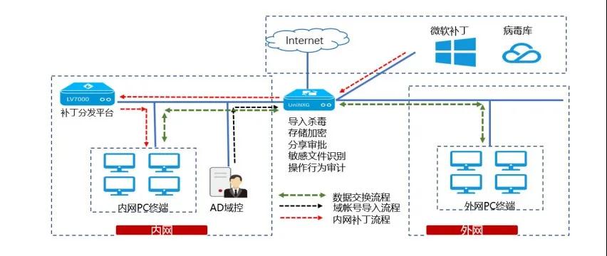 联软UniNXG安全数据交换系统部署在医院内外网间,支持多网交换,查杀毒、审计审批、文档追踪和水印功能,安全解决医院网络隔离、网间及网内数据传输、交换、共享/分享、存储等问题。