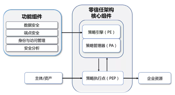 标准对零信任架构ZTA的定义如下:利用零信任的企业网络安全规划,包括概念、思路和组件关系的集合、旨在消除在信息系统和服务中实施精准访问策略的不确定性。该标准强调安全防护应该围绕着资源(数据、负载、应用等),零信任适用于一个组织内部或与合作伙伴协助完成的工作环境,并非常详细地描述了零信任架构的逻辑组件。