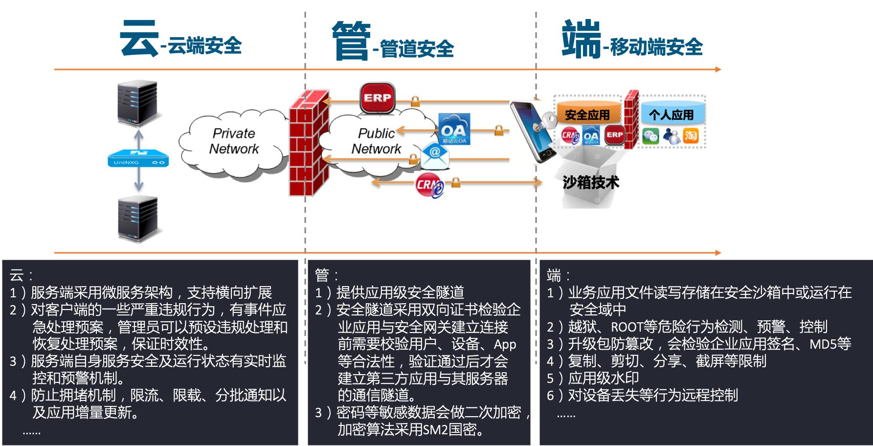 移动安全统一管理:统一的安全框架解决数据安全、通信安全、应用安全、移动设备统一安全管理等问题。