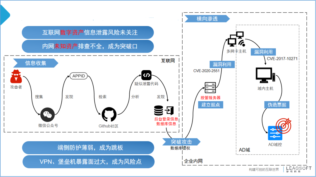 今年我们在参与企业攻防演习中,碰到了企业对于互联网资产梳理的需求,其实在以往与客户的交流中,我们就发现很多企业忽略了社交媒体的重要性,容易给企业网络安全留下了隐患,也容易给攻防演练行动留下缺口。以往年攻防演练行动攻击为案例,攻击者可通过收集到微信公众号AppID,将AppID录入数据泄露监控模块中,发现github有配置信息泄露,包含内网信息,最终达到突破攻击的效果。