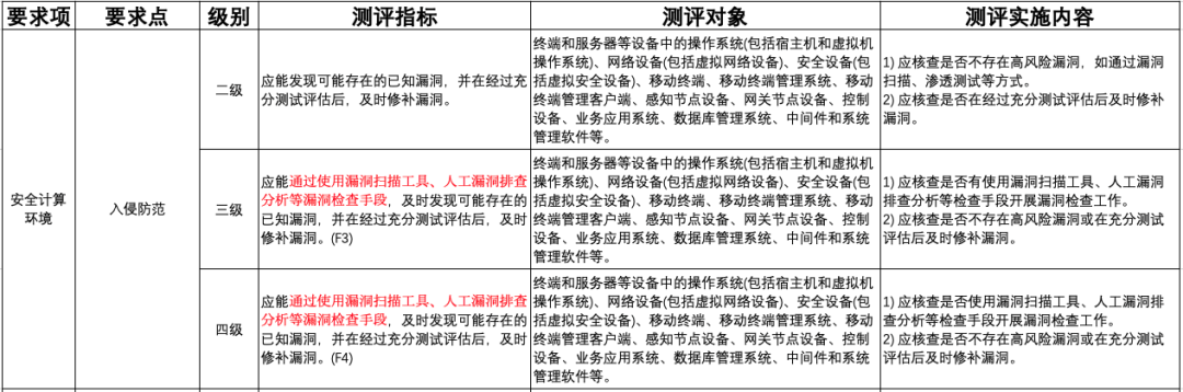 本标准涉及漏洞管理的安全测评通用要求主要是安全计算环境、安全管理机构和安全运维管理3个部分,并且每个级别测评要求有个别差异。