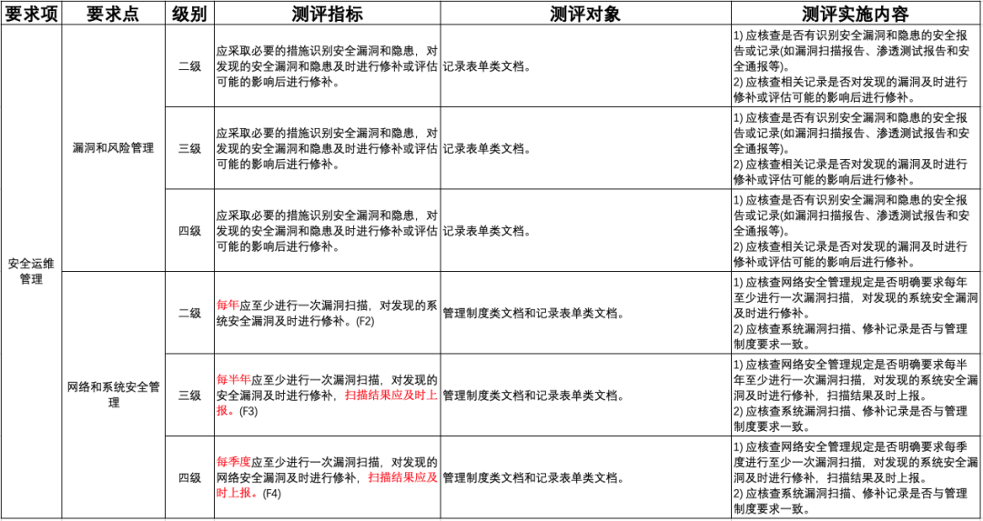 网络和系统安全管理要求明确提出针对不同等级保护对象有不同的漏洞扫描和修补要求。二级要求每年至少进行一次漏洞扫描,三级要求每半年至少进行一次漏洞扫描,四级要求每季度至少进行一次漏洞扫描,并且三级以上要求上报漏洞扫描结果。测评对象要求覆盖了管理制度类文档和记录表单列文档。