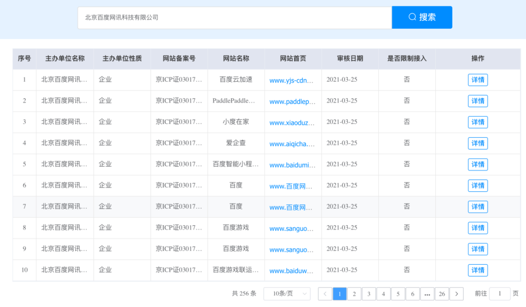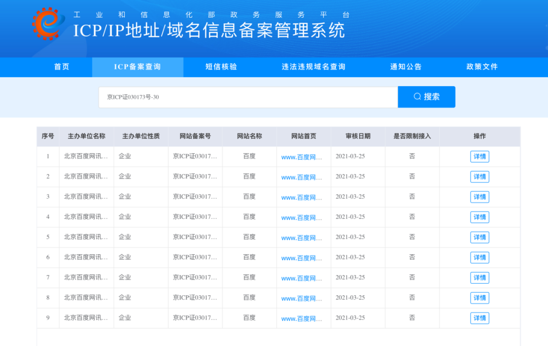 通过工信部的备案查询来获取公司所注册的的域名,下面以百度为例,直接搜索对应的备案号即可。