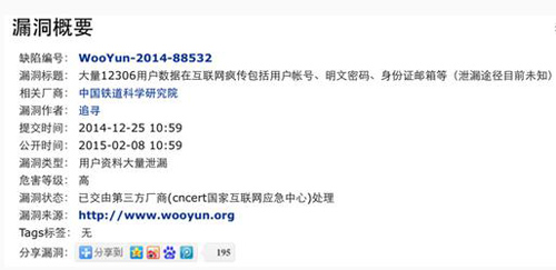 12月25日中午午,漏洞报告平台乌云网发布了一则关于12306的漏洞报告,危害等级显示为“高”,漏洞类型则是“用户资料大量泄漏”,所有注册了12306用户的账号、明文密码、身份证、邮箱等敏感信息都有可能被泄露。目前该漏洞已经提交给了国家互联网应急中心进行处理,泄露途径尚不清楚。当日,中国铁路客户服务中心通过12306官方网站发布公告表示,网站数据库所有用户密码均为多次加密的非明文转换码,网上泄露的用户信息系经其他网站或渠道流出。