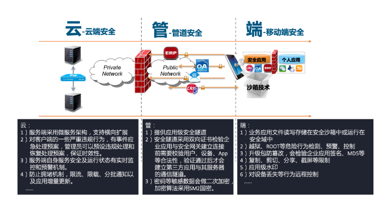 统一的安全框架解决数据安全、通信安全、应用安全、移动设备统一安全管理等问题。