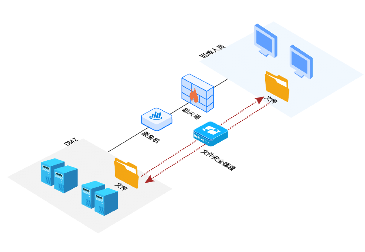 为解决这一问题,联软科技在自研的安全数据交换系统(UniNXG)的基础上,推出了与堡垒机相结合的方案,通过此方案,弥补了堡垒机在敏感数据检查、数据防病毒等方面的不足之处,为数据进出数据中心提供了安全、合规、高效的通道。