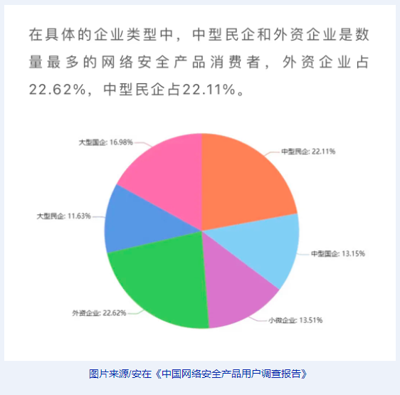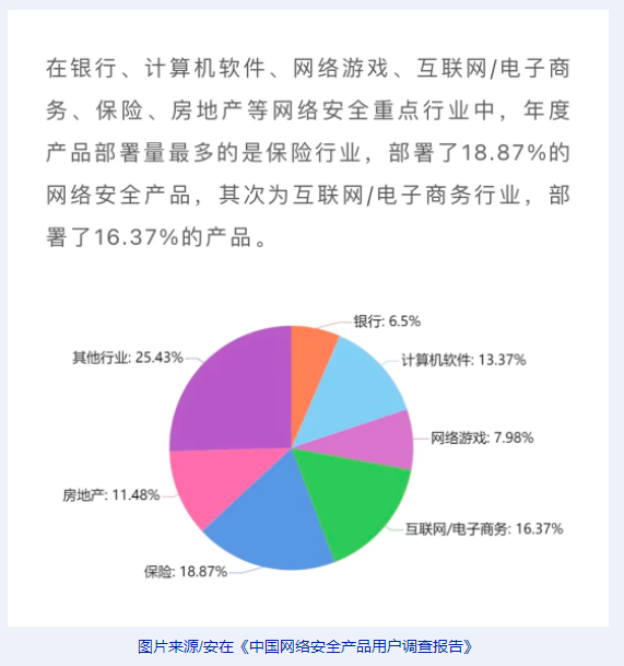 《2020年中国网络安全产品用户调查报告》显示,对网络安全的投资较高的是互联网/电子商务企业,其余依次为金融业、计算机软件企业、网络游戏企业。《2021年中国网络安全产品用户调查报告》发布的网络安全百强榜上,排名前列的分别是奇安信、三六零、华为、阿里、腾讯、深信服、绿盟、微软、安恒、金山、天融信、联软科技、亚信、百度、山石、联想、思科等。