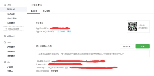 接下来,在微信公众后台点击“开发者中心”, 在配置项中填入接口相应URL和Token。