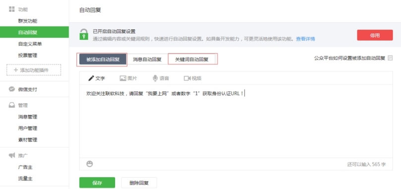 微信管理后台“自动回复”中设置“被添加自动回复”和“关键词自动回复”。