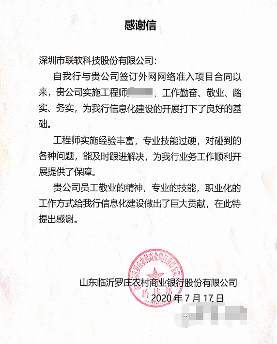 对于罗庄农村商业银行发来的感谢信,联软科技感到十分的荣幸,并感谢罗庄农村商业银行相关部门同事在此次项目实施过程当中给予的各方面支持。