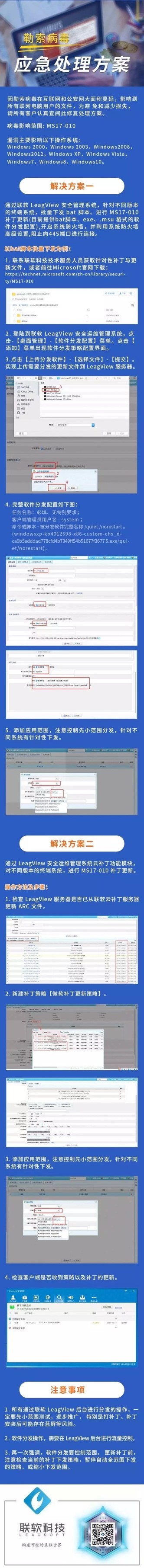 1、请立即通过联软管控中心下发补丁更新检查策略,查找所有未修复MS17-010补丁的电脑,一旦发现有未修复此补丁的电脑,立即通过联软准入控制进行网络隔离,并在隔离区通过补丁管理功能进行补丁分发。