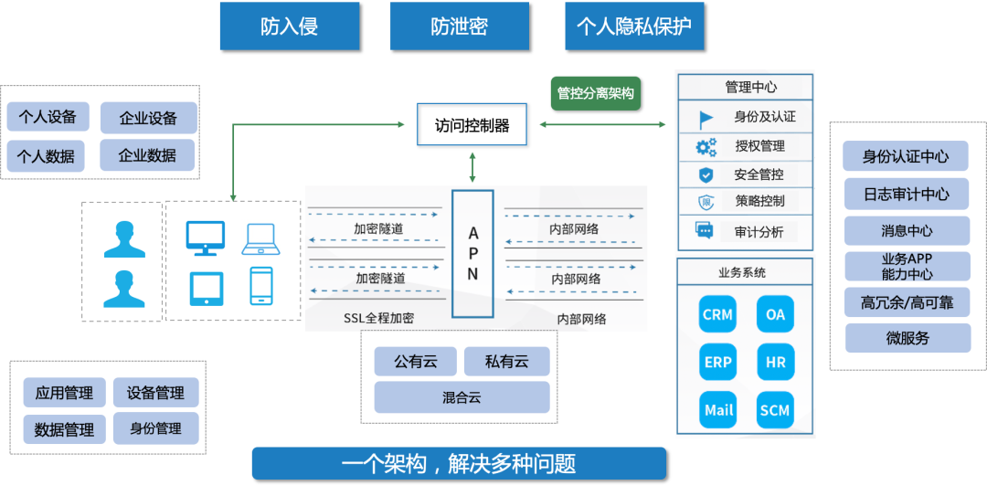统一的移动安全平台解决企业员工个人移动设备,企业配发移动设备,访客移动设备及研发测试移动设备安全场景。