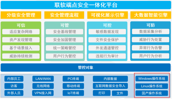 联软LeagView统一管理平台,是联软科技结合多年的终端安全建设经验自主研发出来的旗舰级产品,通过一个平台,统一框架,数据集中,实现国产化与非国产终端的安全保护,涉及网络准入控制、网络智能防御、桌面安全管理等方面,并完成了后台服务器的国产化适配,为用户提供一体化、全方位的网络与信息安全解决方案。