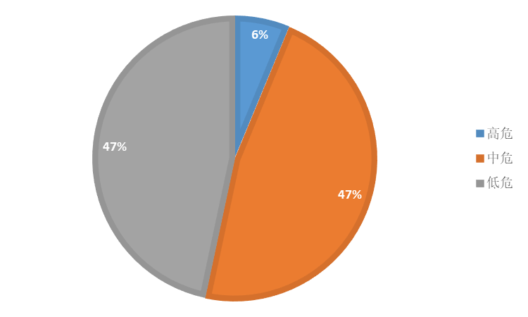 本次监测分析覆盖北京、深圳、浙江等省市共1529家互联网金融平台网站。按照风险的强弱等级进行统计,其中高危评级网站占比12.4%,中危评级网站占比52.5%。共发现漏洞7210个,其中高危漏洞451个,占比6.2%,中危漏洞3395个,占比47.1%,危险等级分布如下图所示。