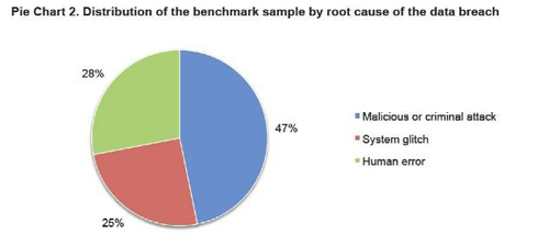 报告显示,数据泄露事件的主要根源中,47%的事件涉及恶意或犯罪行为,25%是由于员工或承包商疏忽(人为因素),28%涉及系统故障,包括IT和业务流程故障。