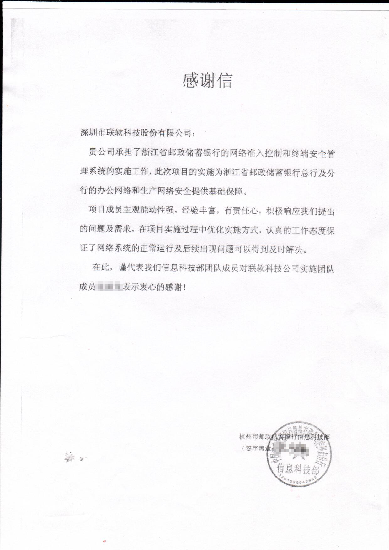 对于浙江邮储银行(杭州分行)发来的感谢信,联软科技也感到十分的荣幸,并感谢浙江邮储银行(杭州分行)相关部门同事在此次项目实施过程当中给予的各方面支持。