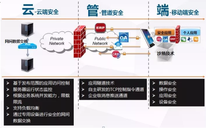 1、智能移动设备边界安全控制:从移动终端、安全隧道、管理平台三部分对企业实行移动安全门户统一入口,统一双向认证、终端安全检查、单点登录,通过内置的安全沙箱实现个人数据和企业数据隔离,并对企业数据采用高强度加密手段,防止数据被非法获取和泄露,同时对数据安全通道实行应用隔离,对数据进行端到端加密,确保数据传输安全。另外,此次提供的解决方案本身还采用了业界领先的微服务技术架构,可以根据用户业务能力进行横向扩展,并将所有微服务在云端进行集中管控,适应多中心云部署需要。