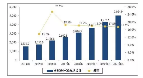 根据Gartner统计,2018年全球云计算(即云计算服务)市场规模达到3,076.5亿美元,同比2017年增长18.2%。伴随着企业逐渐倾向于追求数字化商业战略,传统IT服务向云端服务转变,全球云计算市场规模将进一步增长,赛迪预计,到2021年全球云计算市场规模将达到5,024.9亿美元,未来三年年均增长率为17.8。
