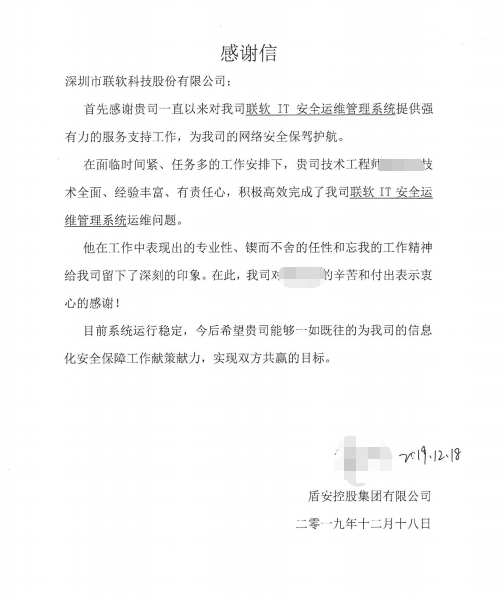 信中对于我司此次所承担的联软IT安全运维管理系统的服务支持工作给予了高度评价。