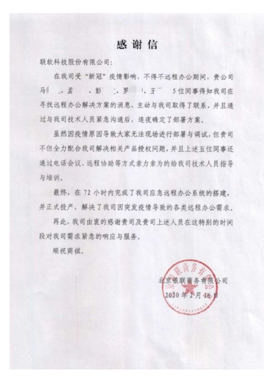 而本次联软团队积极主动的态度以及SDP远程办公方案良好的使用体验均深获客户认可,在系统正式上线后,我们收到了来自银联商务的感谢信。特殊时期,联软人奋斗在医院、金融、政府等各行业,与客户共克艰难,保障安全生产,为社会抗疫复工贡献自己的一份力量。