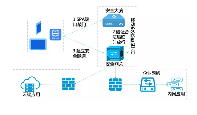构建了可信的企业空间后,企业应用通过企业空间发起到业务系统的可信连接,采用SPA(Single Packet Authorization 单包授权)技术校验了可信用户和可信应用后,才会暂时开放连接端口建立加密的可信连接。