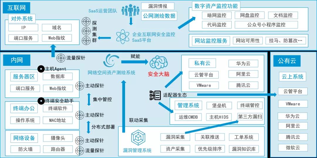 此外,除了企业内网的资产识别和安全管理,随着公有云、混合云的广泛使用,企业有越来越多的资产暴露在互联网上,如果说内网可以利用地利优势排兵布阵,那么互联网就需要以黑客的视角,通过类似于遥感的方式对未知的互联网进行探测,从主域名到子域名,从IP地址到IP地址段,从软件到中间件,从漏洞信息到POC验证,由点到面,逐步描绘出我们资产的位置、内在结构、安全情况,一旦出现某个漏洞的紧急事件可以第一时间根据资产指纹快速的定位并响应。除此之外还应该对GitHub等开源社区,甚至于暗网进行持续的监控,以全面发现我们企业的资产,从而实现以资产为驱动的管控目标。