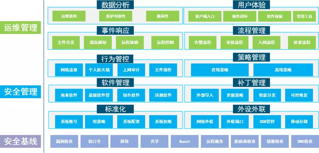 ●终端安全运营框架:从指标可视、场景管理、分期建设、安全分析、流程管理、场景管理、资产驱动7个方面搭建整体框架。